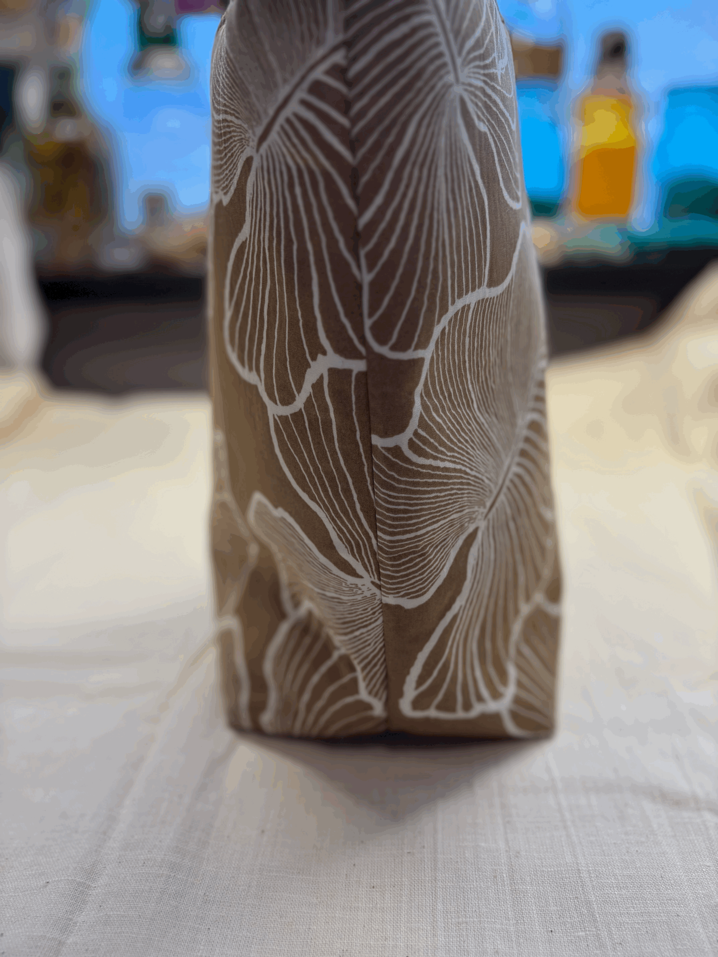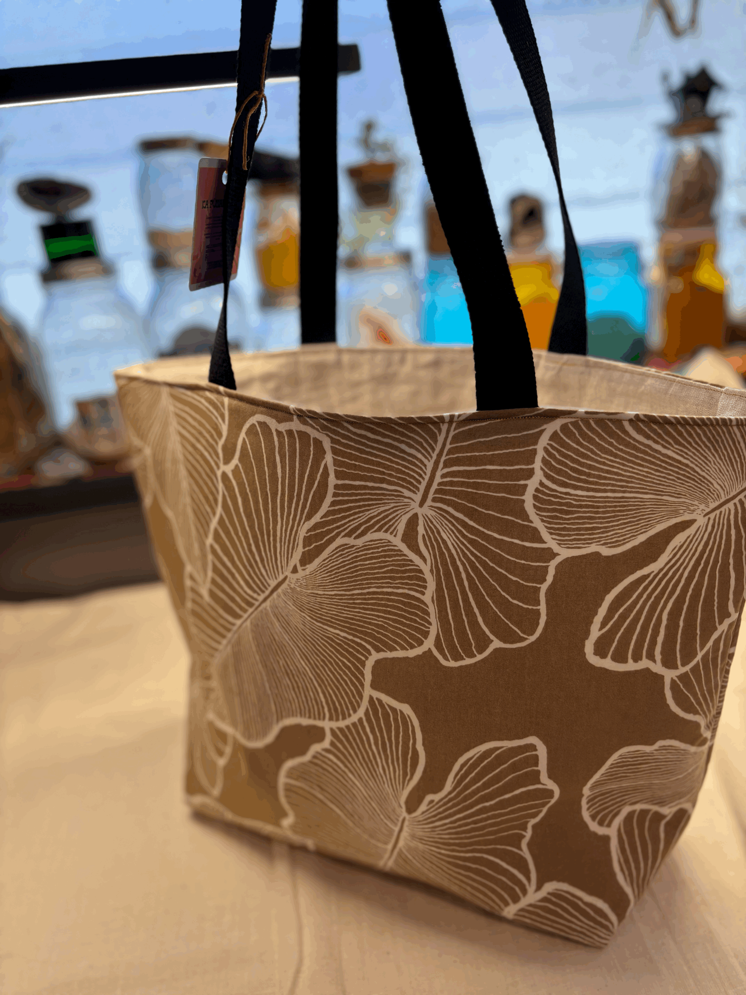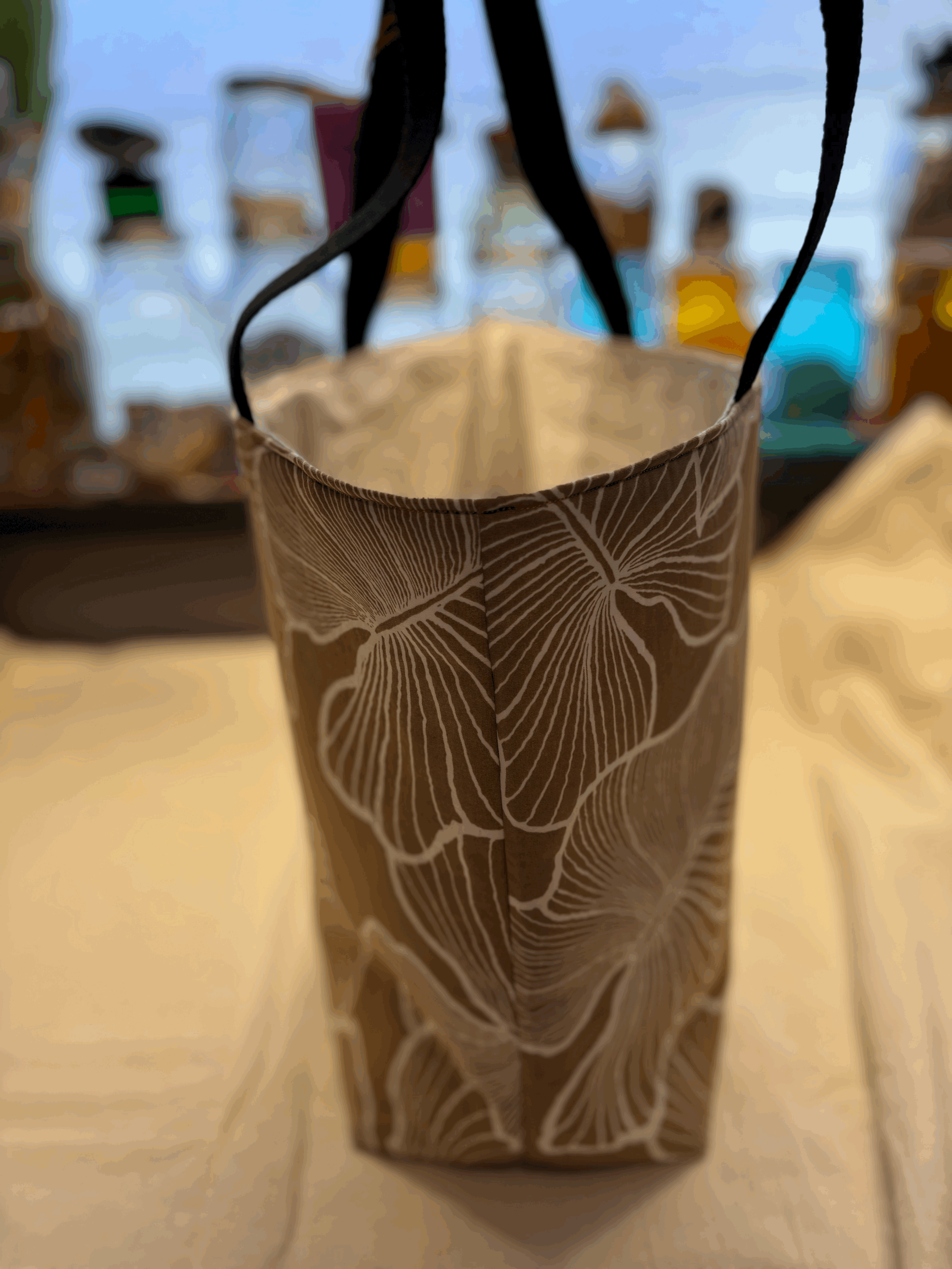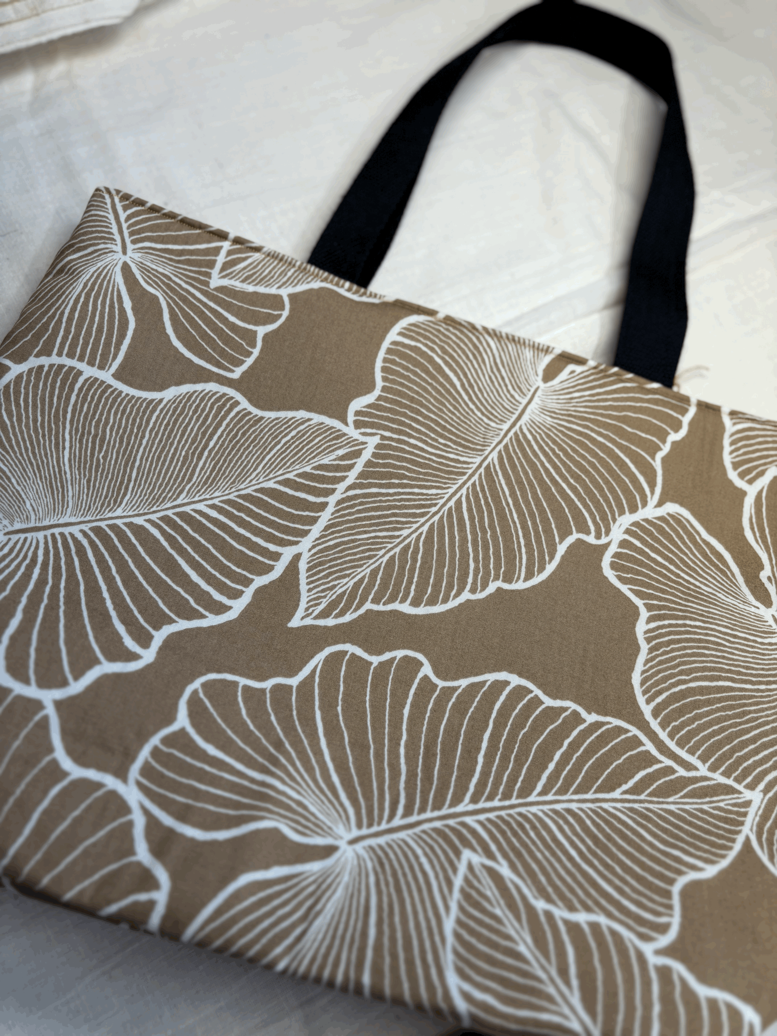 These totebags are a beautiful Tan with Off White Palms, Black Webbing Straps 24” each. Linen Lining and padded with infusible fleece for thickness. Perfect for any occasion. It is very common to see Hawai’i women with ‘eke (bag) like these.