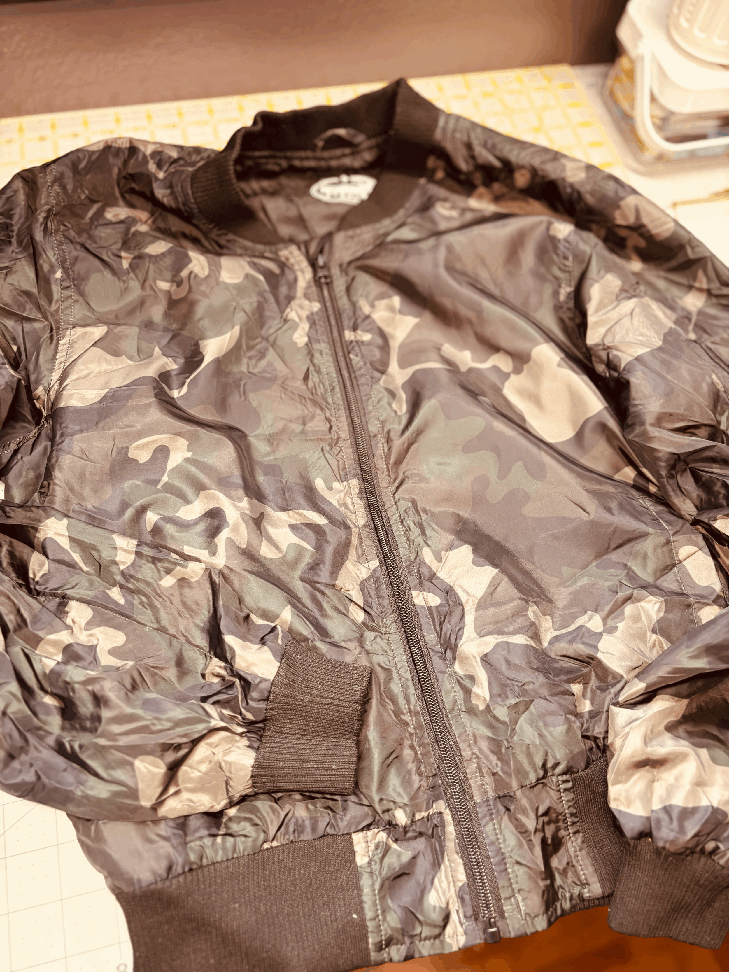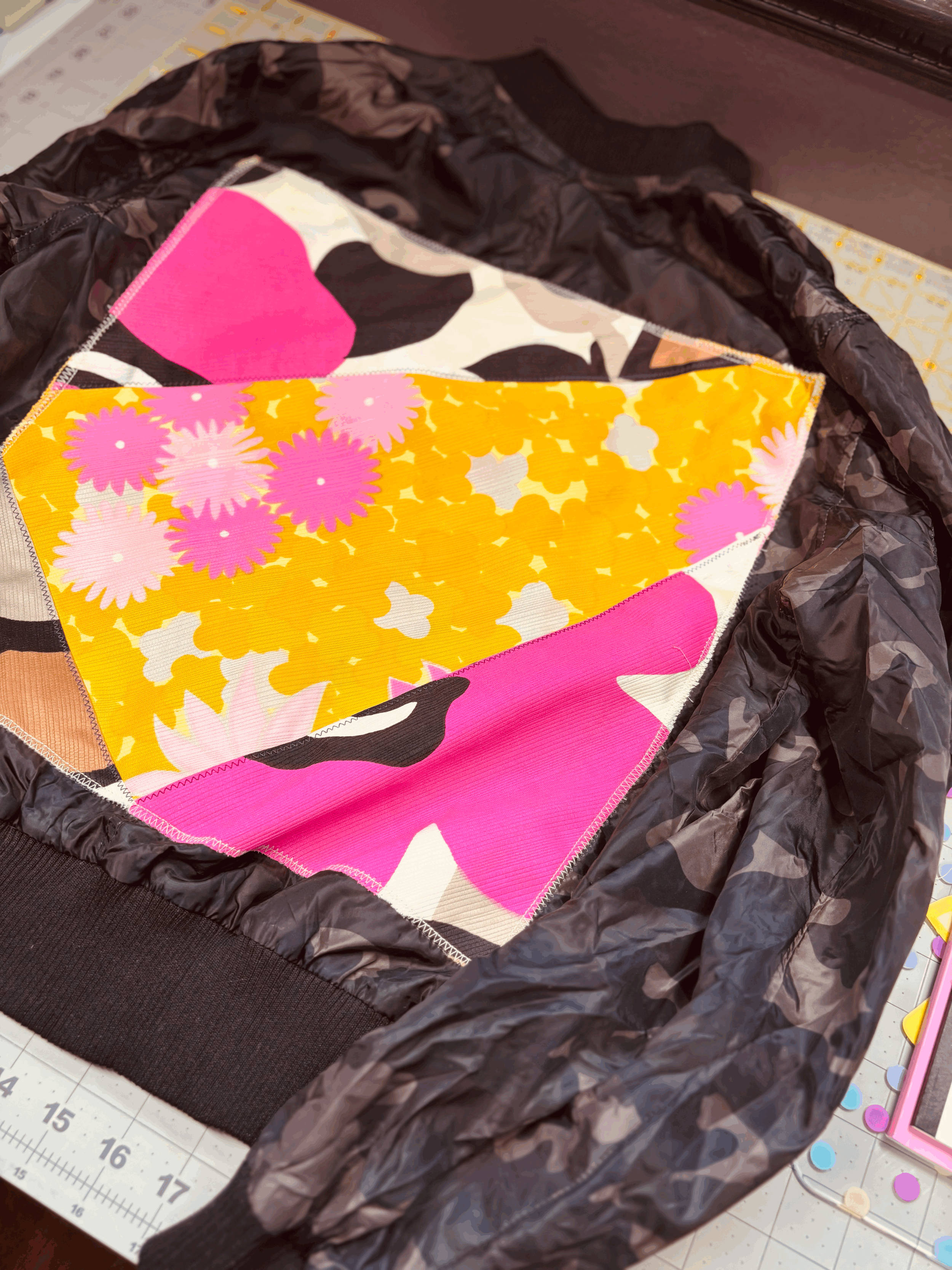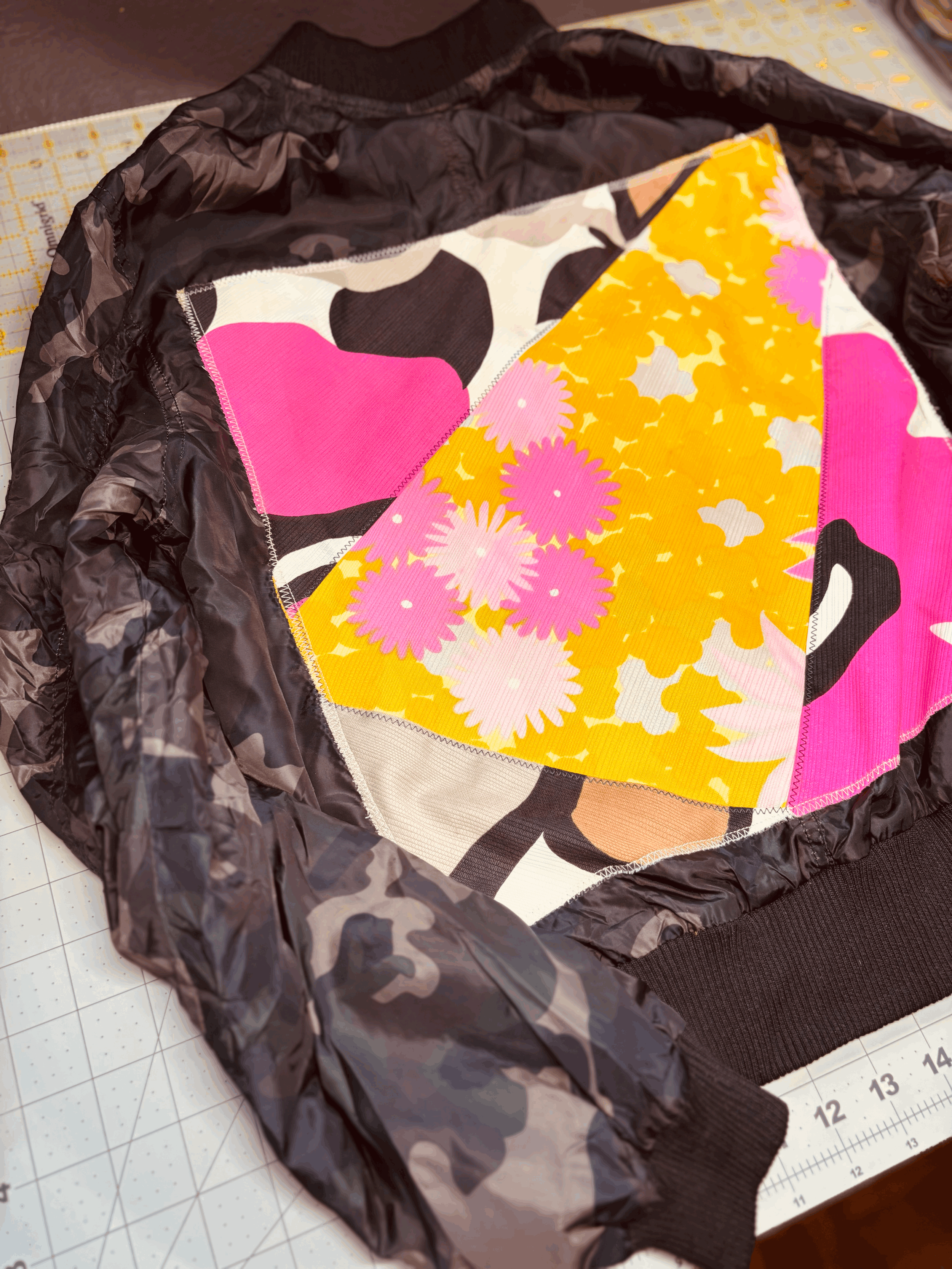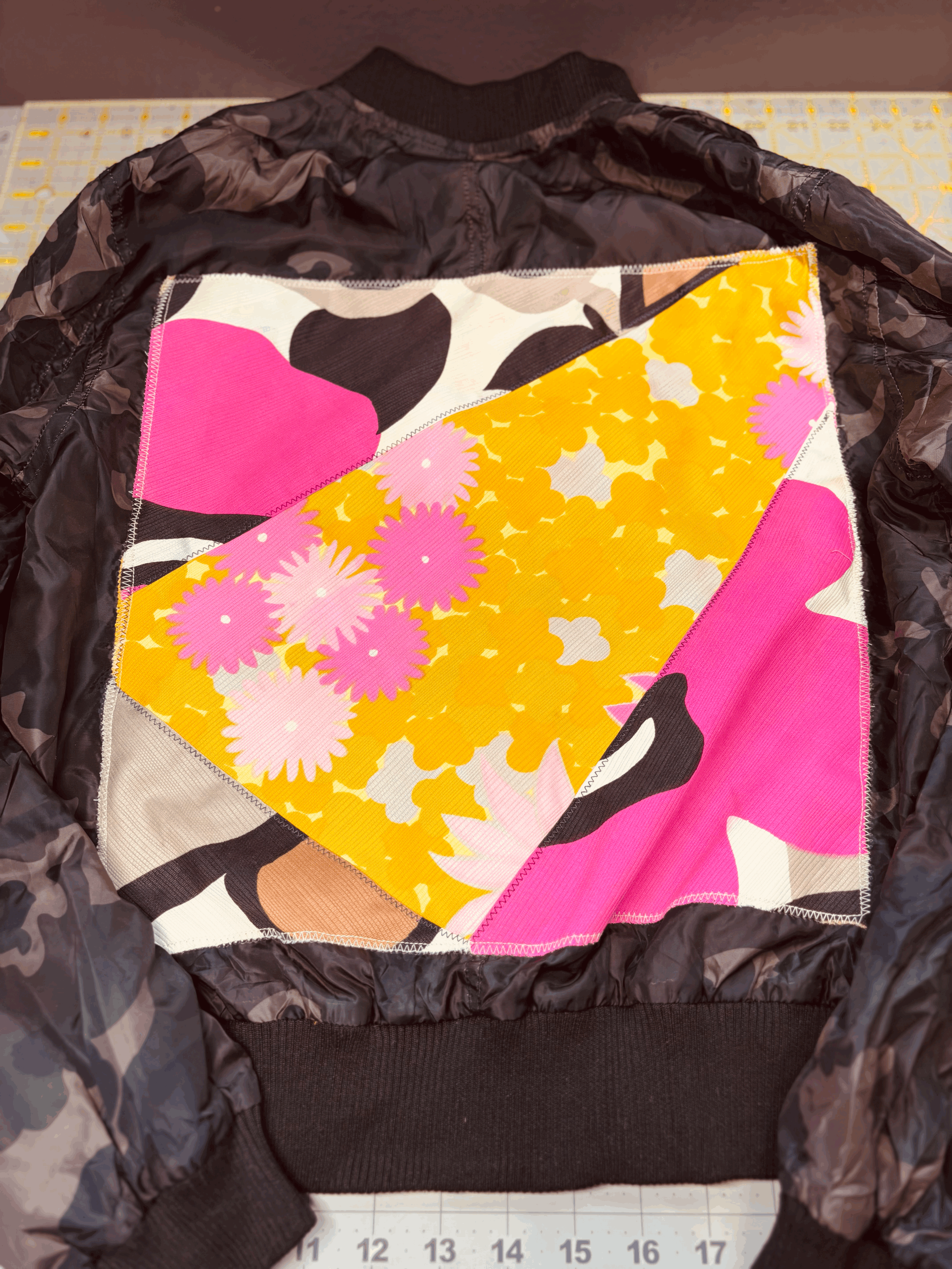 This jacket is thin like a windbreaker, it is easy to travel with, and is perfect for anyone who loves vintage with a touch of the Pacifika. I used vintage Hawaiian material with the couching method to add color to the back panel.
