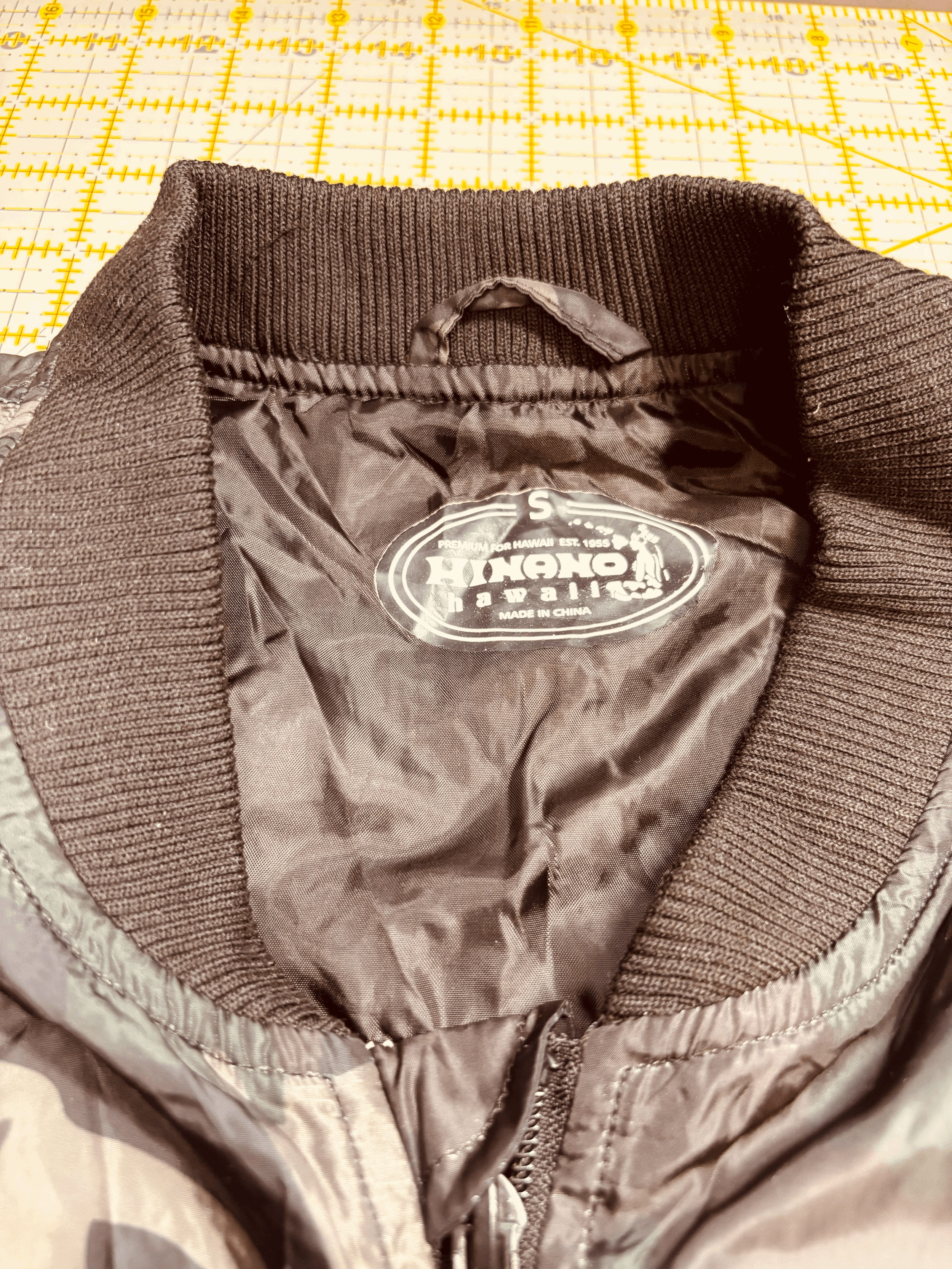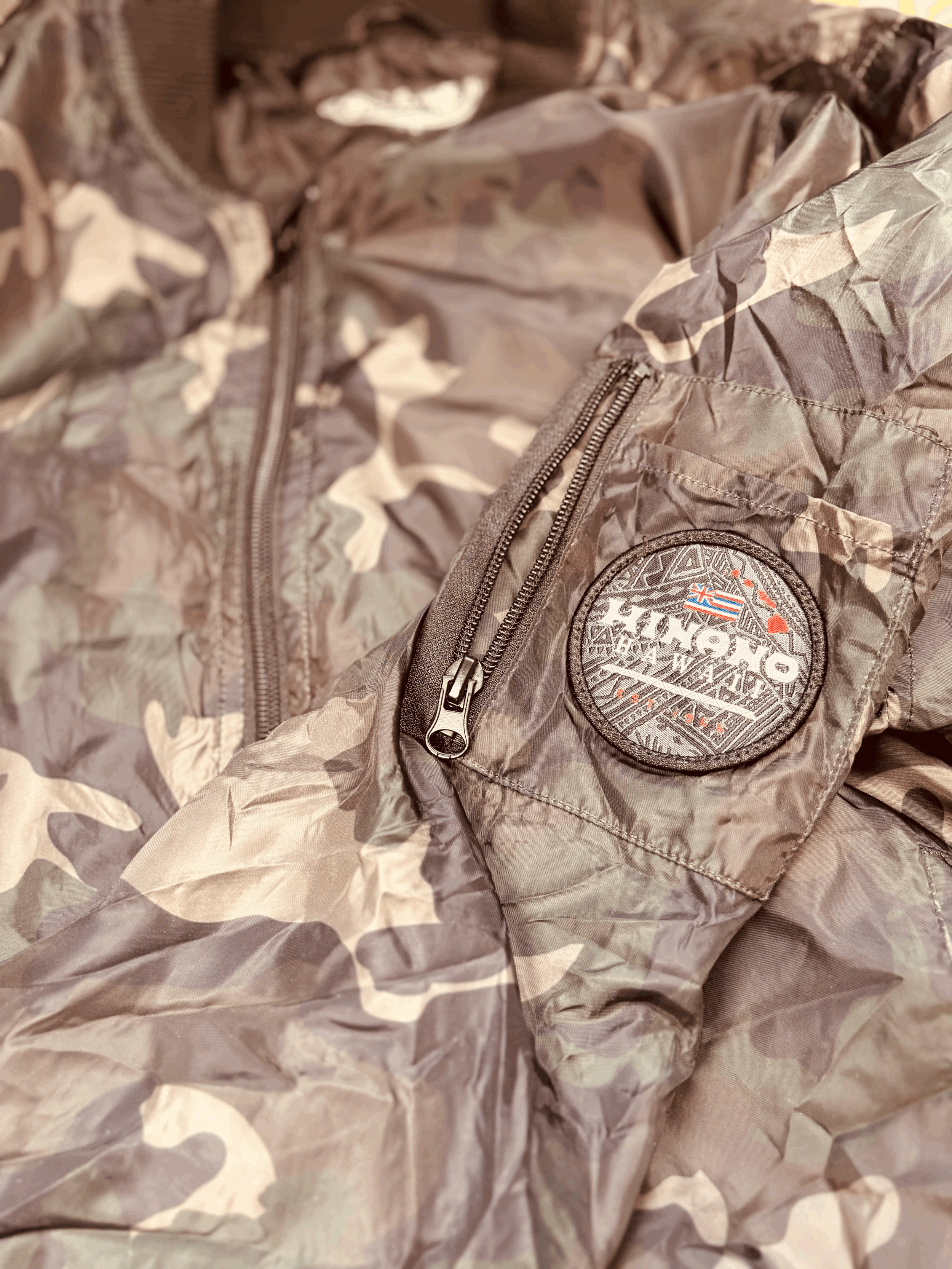 This jacket is a size SMALL, it has 2 front pockets, and 1 arm pocket. Brand: Hinano which is popular Tahitian brand dating back to 1955. Hinano was a beer brand with its famous Vahine Logo which we in Hawai’i know and love.